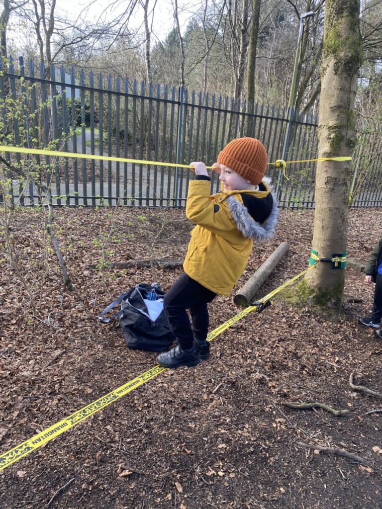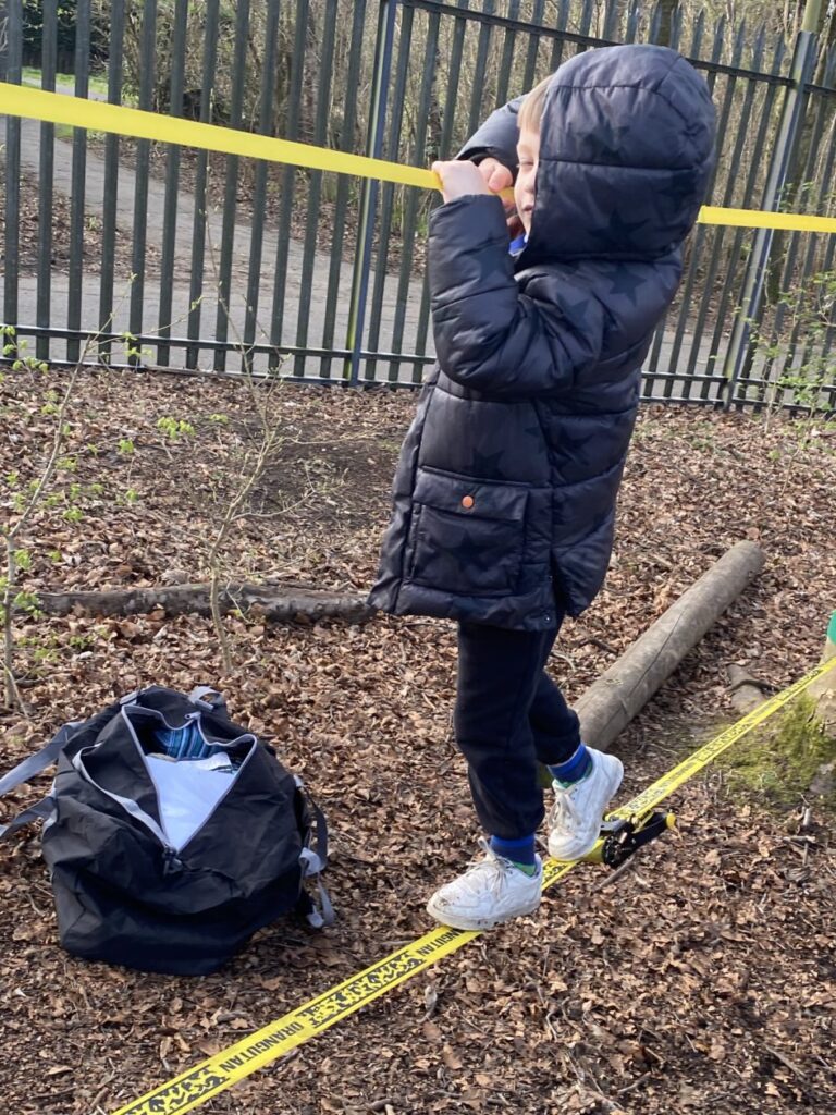 On Monday we had an outdoor learning session Kids Gone Wild with Rob and his therapy dog Jax. We got to play sticky boots and we walked along a slack line. It was very wobbly and we had to use our balance to help us stay up right. Mrs Russell was very proud and impressed with us all for walking across the line and being so brave.