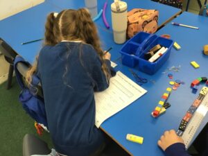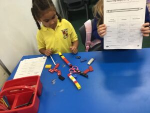 In maths we were measuring different classroom items in non standard units. We estimated their length and then measured them in cubes, paperclips, counters and dominoes. We then used rules to measure them using rulers to get a standard measurement.