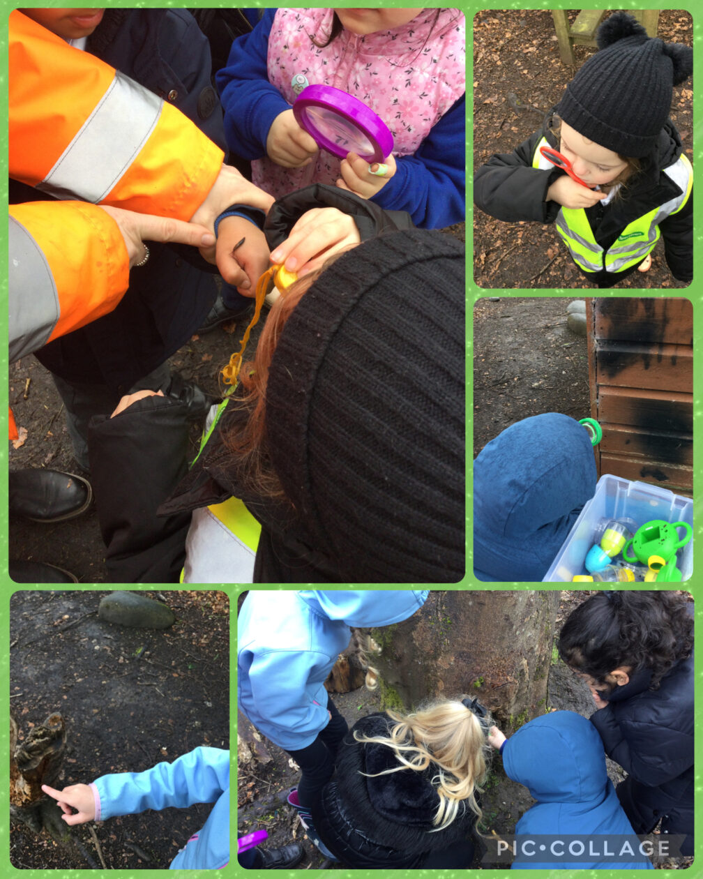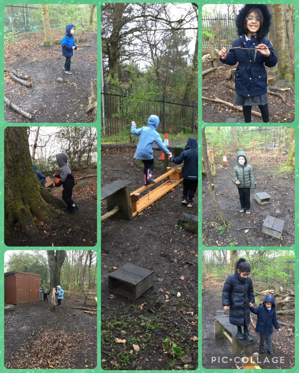 For Outdoor Learning, we read the book ‘Not a Stick’ and then found sticks in the wood and used our imaginations to change them into something else. We also did some bug hunting and played on some obstacle courses that some upper area classes had made.